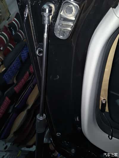 第一根撑杆装车,这个撑杆是分左右的,撑杆上有标志,L左,R右,大家肯定知道,在拆除原车撑杆时,一定要有个人扶着后备箱,因为一个撑杆是撑不住后备箱的,咱们后备箱还是很有分量的。