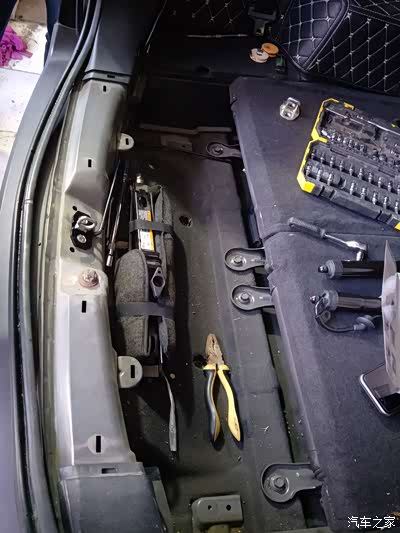 现在需要把后备箱那个置物盒拆掉,置物盒两边有两个裸露的螺丝,卸掉,然后把后面的胶条撕开(可以反复拆的不用担心)有几个铁卡子,也是用巧劲就能拔开,拆掉就是现在这个样子