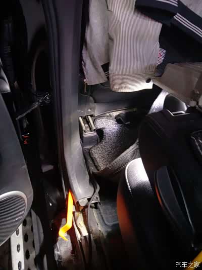 这是第三排的位置,因为第三排用到的频率不高,不会有人在后面来回踩,所以就没有拆座椅,把线只需要用塑料翘板塞进黑塑料装饰板里就可以了。