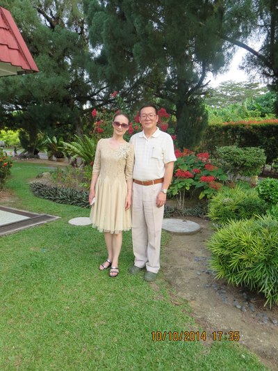 我和夫人在王董事长别墅花园里留影