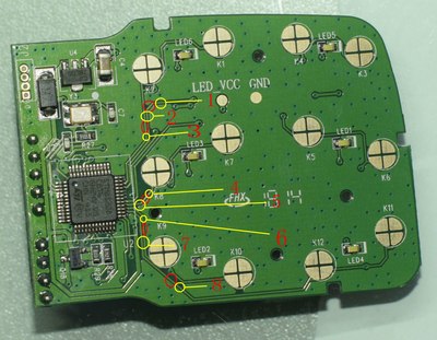 黄圈中1和3连接飞线,2圈中两根线焊接在一起,4和6连接飞线,5和8连接飞线,7圈中两根线焊接在一起