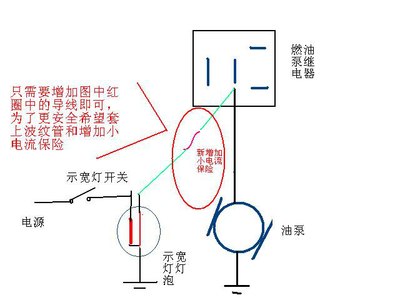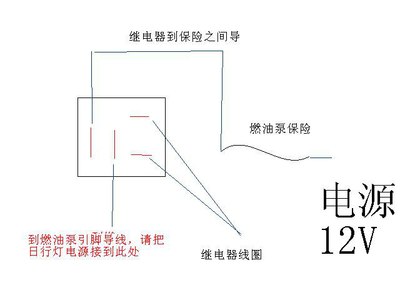 按示意图把日行灯电源线接到继电器引脚上。因为油泵保险是15A的,日行灯功率只有0.8A的,大家可以在日行车电源线上串个小电流的保险丝,这样安全系统更高。