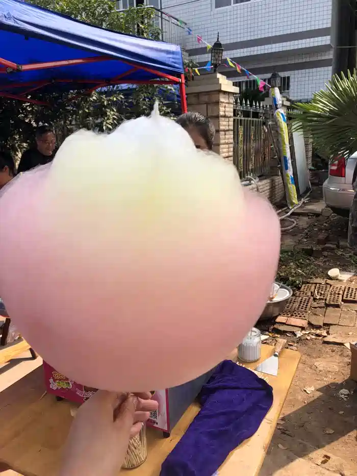 一进去女儿就想吃,一天嘴巴管不住,看到什么都想吃,看到个老爷爷在卖棉花糖,扭着闹着要买,她最喜欢吃甜的了,平时在家里她爸爸管着也吃得少,这下出来还是放纵她了。