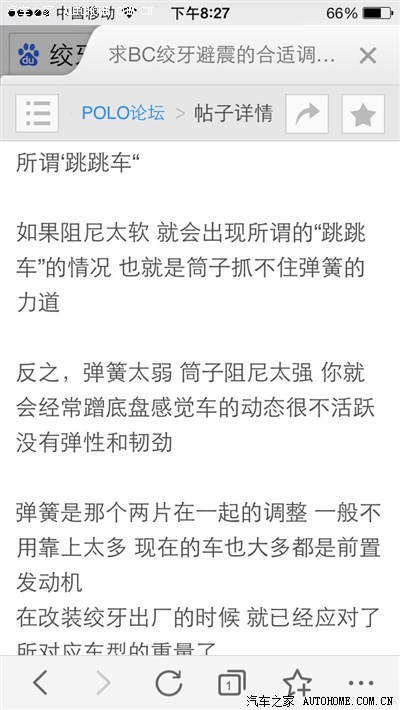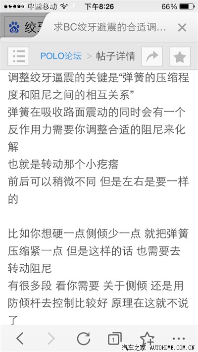 试车,开到马路上转了一圈心跌到谷底了,各种不舒服,车子上下跳,开了一下人有点想吐的感觉,回到店里同老板讲,老板说是避震硬了,说以前台产绞牙避震都有这毛病,后来改进了做软了。他建议将阻尼调到最软,又试了一圈,好了很多,明显感觉阻尼软了很多,但是车子还是上下晃,还是很不适。没办法,回家慢慢研究,我开始网上搜
