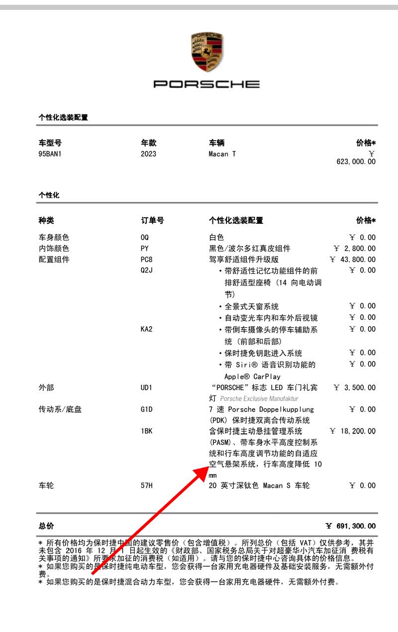个人出售保时捷macan T !2.0排量。2023年9月上牌,行驶2.1万里,有车衣,无刮蹭,无事故。T的标配比普通macan多运动套件,差异详见图4。相当于配置单加这些配置。