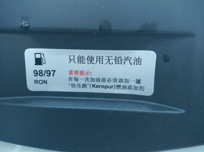 油箱盖:交车的时候4S销售特意打开来让我看这句话,快乐跑必须添加,应该是4S自己贴的吧