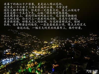 西江的苗寨群落很大,两连山上的吊脚楼群下一条被修整的河道环绕着他们。水波碧绿,廊桥的彩灯映出斑斓的光。夜晚的千户苗寨景色迷人,由于正值淡季观景台上只有少许的游客,虽然人不多但是大家都期待着万家灯火点亮。晚上大约20点时远处的吊脚楼有小部分屋檐角的LED灯亮了。过了一会儿,又一大片LED灯亮了。其实很美,只是少了些带着炊烟的等待。村上管理处的一排开关,就让灯火准点亮起来。其实多少还是有些失望,我一直以为西江千户苗寨夜灯是透过吊脚楼里村人们敞开的木窗,一盏一盏,每户若明若暗的灯光。窗里能看到小孩馋嘴的模样,能看到阿公搓捋烟叶,裹起塞进铜烟斗里。灯下慢出一个个烟圈,默不声息的散去。一只黄狗趴在地上,头也不抬的蜷起。有人路过,又警觉的立起身来,向着门外狂叫,人走远了。又悻悻的回来,懒在脚下。还能看到三两个汉子才下地回来,相约一起吃酒。兴头上说着臊话儿,涨红个脸打着哈哈儿。夜深了,女人关了窗,哄娃睡觉。关了灯,铺盖里传来:“你个悖时的......”半牙子细月挂在山头,破晓时,红冠翎子公鸡拉长脖子叫出第一声。