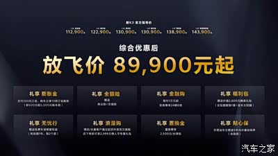 2023年2月13日,新起亚K3在鹭岛厦门正式上市。起亚精心为中国消费者带来了礼享·膨胀金、礼享·全额险、礼享·金融购、礼享·福利包、礼享·无忧行、礼享·浪漫购、礼享·置换金和礼享·贴心保八重礼遇。新车共推出6款车型,官方指导价为11.29万元-14.39万元,综合优惠后“放飞价”仅8.99万元起。新K3定位驾趣新生代家轿,产品实力全面进阶,旨在为年轻家庭带来高品质出行体验。