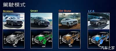 且 Levante 不但和 Quattroporte、Ghibli 一样,配置出自 ZF 的 8 速手自排变速箱 (型号为 ZF AT8-HP70),并除了 NORMAL (一般)、M (手排)、SPORT (跑车) 及 I.C.E. (Increased Control and Efficiency 效能与控制提升) 模式外,还多了 OFF-ROAD (越野) 模式,能够在越野时与 ESP 电子车身动态系统连动,视情况进行档位和车速的升降控制。