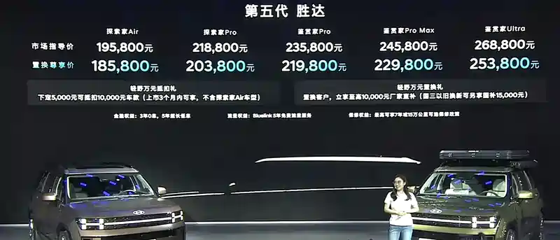 8月30日,北京现代第五代胜达在成都车展亮相,官方指导价19.58~26.88万。 置换尊享价是18.58~25.38。