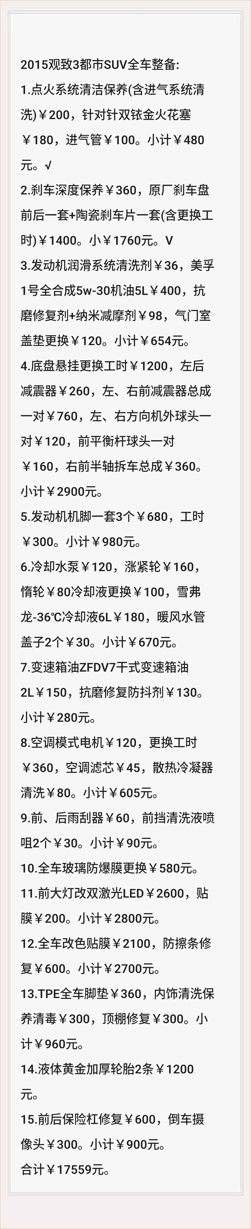 第二天从温州开回宜春,手动模式全程高速油耗5.3,最低到过5.1,说明变速箱本身没大问题。经过几天底盘整备及机脚更换,换挡顿挫、延迟基本消失,自动模式除1一2略有换挡感3挡以上几乎没有任何感觉,平顺性可以说比大众的双离合好一些。两箱油的上下班市区+国道平均时速35左右的综合油耗在6.5左右,距离我想要达到的5.5左右还是没有大问题。附上我的全车整备方案,供观致车友们参考。