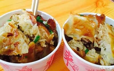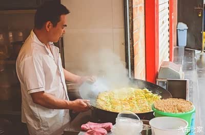 炉火大灶,庞然巨锅,上好的糯米配上绿豆粉面糊,泼上鸡蛋,加入鲜肉、香菇丁、竹笋丁、豆腐熏干,出锅前撒上葱末,一气呵成。