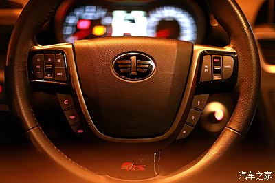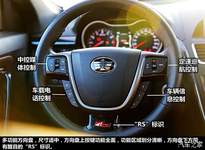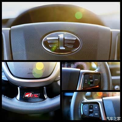 多功能方向盘,尺寸适中,方向盘上按键功能全面,功能区域划分清晰,方向盘下方带有醒目的“RS”标识。