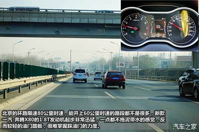 北京的环路限速80公里时速,能开上60公里时速的路段都不是很多,新款一汽-奔腾X80的1.8T发动机起步非常迅猛,一点都不拖泥带水的感觉,反而较轻的油门踏板,很难掌握踩油门的力度。