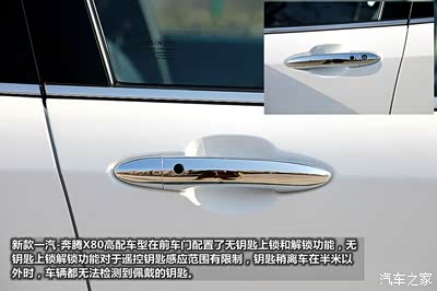 新款一汽-奔腾X80高配车型在前车门配置了无钥匙上锁和解锁功能,无钥匙上锁解锁功能对于遥控钥匙感应范围有限制,钥匙稍离车在半米以外车辆都无法检测到佩戴的钥匙。