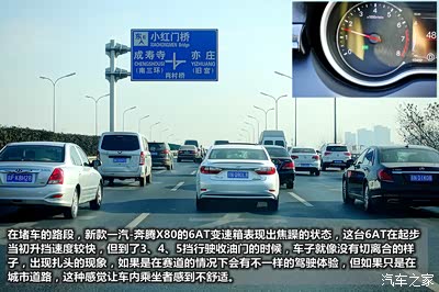 在堵车的路段,新款一汽-奔腾X80的6AT变速箱表现出焦躁的状态,这台6AT在起步当初升挡速度较快,但到了3、4、5挡行驶收油门的时候,车子就像没有切离合的样子,出现扎头的现象,如果是在赛道的情况下会有不一样的驾驶体验,但如果只是在城市道路,这种感觉让车内乘坐者感到不舒适。