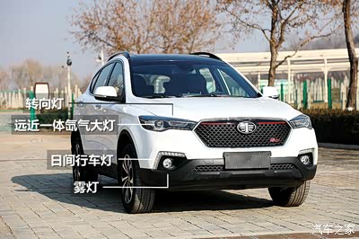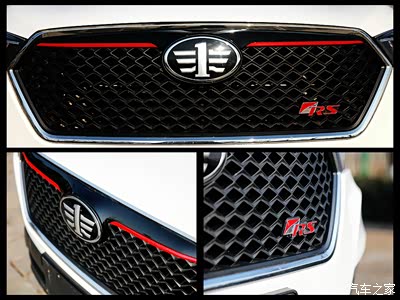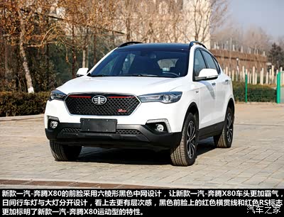 新款一汽-奔腾X80的前脸采用六棱形黑色中网设计,让新款一汽-奔腾X80车头更加霸气,日间行车灯与大灯分开设计,看上去更有层次感,黑色前脸上的红色横贯线和红色RS标志更加标明了新款一汽-奔腾X80运动型的特性。