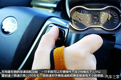 方向盘右侧的定速巡航功能,一只手就可以方便操作,在D挡模式下120公里时速,转速只有2200左右,低转速对于降低油耗和降低噪音有不少的帮助。