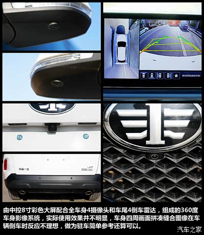 由中控8寸彩色大屏配合全车身4摄像头和车尾4倒车雷达,组成的360度车身影像系统,实际使用效果并不明显,车身四周画面拼凑缝合图像在车辆倒车时反应不理想,做为驻车简单参考还算可以。