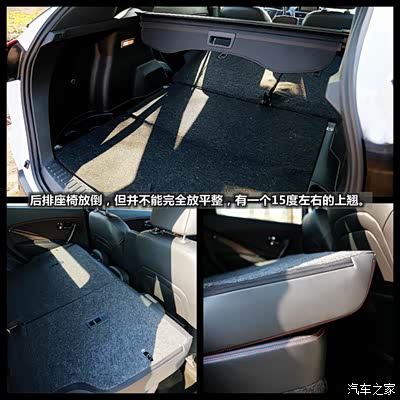 后排座椅放倒,但并不能完全放平整,有一个15度左右的上翘。