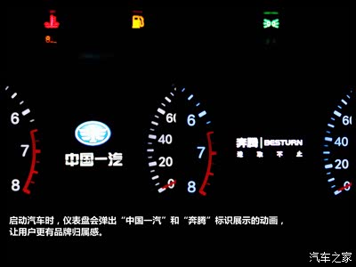 启动汽车时,仪表盘会弹出“中国一汽”和“奔腾”标识展示的动画,让用户更有品牌归属感。