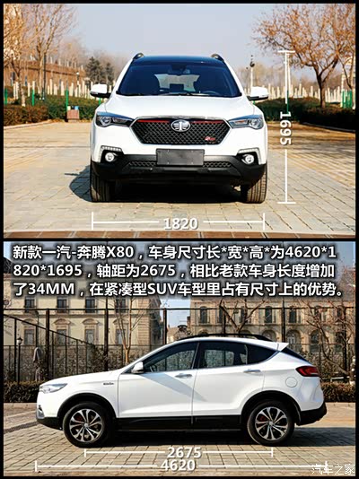 新款一汽-奔腾X80,车身尺寸长*宽*高*为4620*1820*1695,轴距为2675,相比老款车身长度增加了34MM,在紧凑型SUV车型里占有尺寸上的优势。