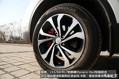 规格:215/60/R17的韩泰Dynpro Hp2轮胎配合,双五幅动感造轮毂和红色刹车卡钳,视觉效果非常不错。