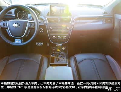 幸福的阳光从窗外洒入车内,让车内充满了幸福的味道,新款一汽-奔腾X80内饰以酷黑为主,中控的“U”字造型的面板配合悬浮式8寸彩色大屏,让车内豪华科技感倍增。