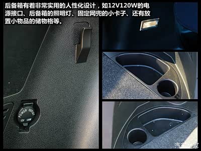 后备箱有着非常实用的人性化设计,如12V120W的电源接口、后备箱的照明灯、固定网兜的小卡子、还有放置小物品的储物格等。