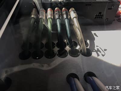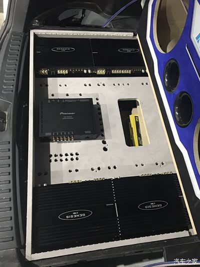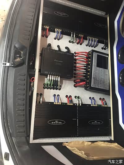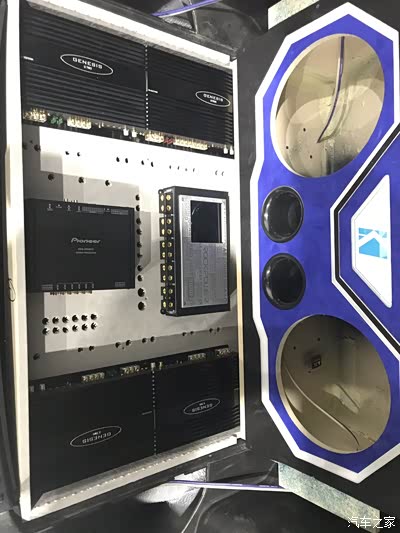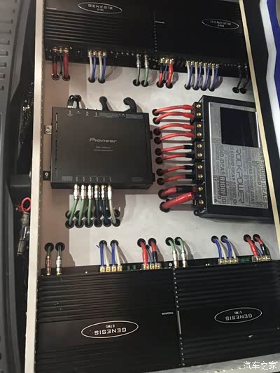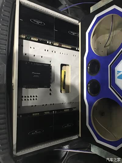 三台两路功放做前声场全主动三分频,二台单路推超低音,一台四路功放推外场二套套装喇叭,一台12路顶级DSP,一台超级电神电源管理器,底下还有一个美国进口史汀格音响发烧专用电瓶