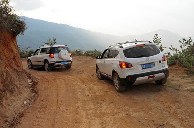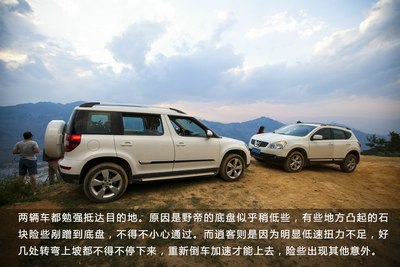结果,两辆车都是勉强抵达了目的地。原因是野帝的底盘似乎稍低些,有些地方凸起的石块险些剐蹭到底盘,不得不慢慢的小心通过。而逍客则是因为明显低速扭力不足,好几处转弯上坡都不得不停下来,重新倒车加速才能上去,这样很容易出现其他意外。