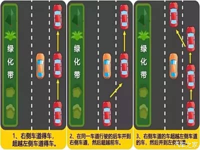 区分属于右侧超车的情况: 怎样属于右侧超车?我国交通法是这样表述的:同一车道的后车并到右侧车道超越前车再回到原车道,这样一个流程才算是右侧超车。但如下图3种情况,红色轿车右侧超过了前车则不算右侧超车。