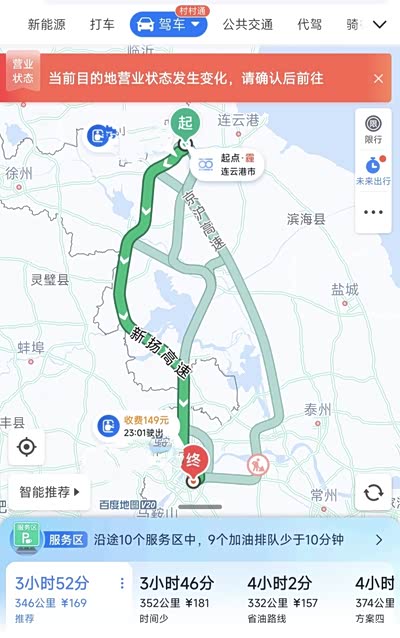 上午从东海县出发,驾车前往南京,全程约[346】公里,预计行驶3个多小时。