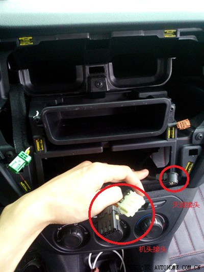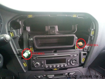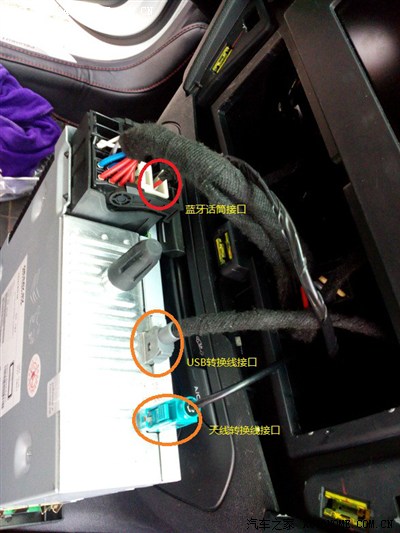 这一部分是大家比较关心的,但当时就我自己做,还要拍照,这部分拍得比较少。就详细点写。首先转换线有一个大头,直接连接到新机头上的,后面还有一个转接口,用来接旧机头之前接的线,原先的线有黑和白的,黑色的接头接到连接线只有两针的那个口,白色的接另外一个,天线转换线和蓝牙话筒和USB转接线就比较简单了,对着新机头上的洞找合适的插就行了(USB连接线可以拉到副驾驶储物盒里,这样就看不到了)。