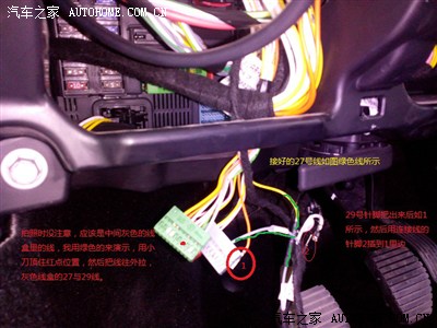 重点说下接BSI的线,拆下面板后,可以在左下方找到一个蓝色的接头,按住顶部的卡子,把灰色的拉扣往左边拉,就可以把接头拆下来了。然后翻转一下,可以看到红灰绿色的线盒,从图中标红点的位置(红色和灰色往左掰,绿色往右掰),把三个线盒都拿下来。每个线盒里都标数字的,拿起灰色的线盒,找到27的针脚,用小刀定下卡子把线拿下来,然后用某宝上买的连接线(卖家已经帮你写好序号了)的针头,插进去(卖家编号27的有两条,一条是针头,一条是针脚),插好后用热缩管包好,再把连接线那端的针脚插回原来的27孔里(其实相当于破线),同理连接29号针孔。