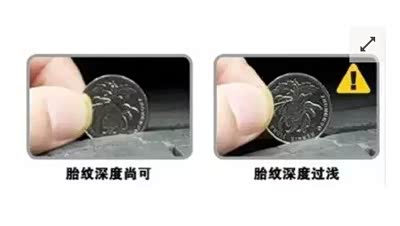 方法一:依据“轮胎磨损标记”进行判断。 磨损标记1:位于轮胎侧面,是一个小小的“△”,一旦轮胎的磨损触碰到了三角形的尖角,这条轮胎必须要更换了。 磨损标记2:位于轮胎的沟槽之间,凸出来的一道高1.6毫米(法定最小沟槽深度)标记。一旦轮胎磨损到胎面与标记平齐,就该换胎了。 方式二:用硬币来判断很简单,拿出一枚1元硬币,顺着硬币顶端方向插入胎面沟壑中,如果还能看到整个硬币背面的标志,说明厚度不足。