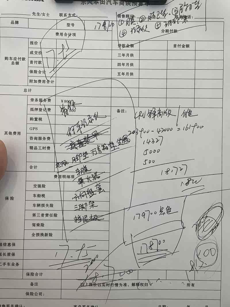 .进去直接咨询HRV.销售带过去以后.一台蓝色的摆在那.决定.就你了.马上就去谈价格.全款.报了价格后.我靠.不是配置一样吗.怎么比ZRV贵.想想回去考虑一下.回家做攻略.找了好几家东风本田4S店网上沟通.聊到了一家河西汽车城的销售.报价挺便宜.第二天一大早就过去面聊.HRV价格确实不错.比之前那家4S便宜.旁边停着CRV.也去感受了一下.我靠这空间.没话说.太舒服了.有种更喜欢的冲动.颜值也比以前的CRV好看.更方正.整齐.打听了一下价格.贵了好几个W.搞不的.然后留了销售VX回去考虑看看选HRV哪个配置.心里在想没有最便宜只有更便宜要多看几个4S店.正好在汽车城这边又看了一下丰田的威兰达.虽然不买看看也可以.进去后了解没啥优惠政策.还卖的贵.车型还不如CRV就走了.又看了一下大众探岳.有人说那个湿式双离合坏了难修.算了.我也不懂这东西.回到家里和几个4S聊.看谁便宜.全款价格.顺便看看论坛.慢慢的感觉好像CRV更实在.HRV好像有点冷门.以后不要了要换车不怎么抵钱.这个时候4S打电话来问决定好了没.现在在考虑是不是选CRV了哦.问了问价格.又给了个心动价.想想座椅也不像HRV那样是织布的.高档一点.第二天又去看了看对标的那个浩影.大是大.居然全款比这个东本的销售报的高.实车没有CRV好看.太圆润了.算了算了.还是去河西吧…订车当天.MM P 这个4S销售居然临时变卦加钱.一汽之下走人…重新去别的店聊.总算经过多次努力拿到了几家店最低的一个.黑色居然没有现车要等几天.算了就选白色.全款18.17.当天就交钱开走.车开起来还不错.空间蛮大.后备箱也大.唯一不满意的就是档把.好丑好丑.没有电动车尾箱.其他的都蛮好.也没有别人说的那么大噪音啊…只是感觉这次买车从10万左右一下提高了不少啊…!