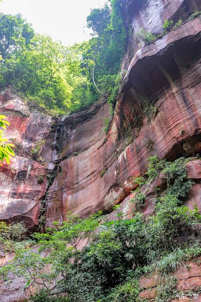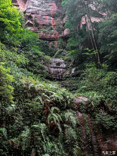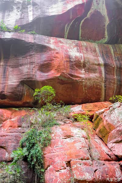 穿过一条食肆小街,这时的眼睛就有些呆滞了。丹霞巍巍,峡谷葱葱。前方左侧岩壁的图案着实让人震撼:山体剖面被山上淌下的水渍勾勒成宽窄不一的黑红条图案,试想,如果到雨季丰水期,这分明就是喷珠溅玉的瀑布飞帘。一块红色卧石矗立在山壁图案下方,上面“赤水丹霞旅游区·大瀑布”赫然其上,大气、大度、彰显。