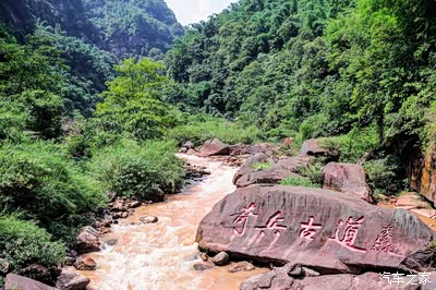 栈道两侧一边临水,一边是山,水流激荡就在耳边,山体露红浓荫翠竹。一块水中巨石上阴刻着“奇兵古道”,环视周围暗藏险境。