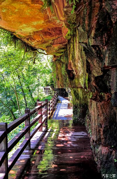 一路变幻着风采的水之舞水之韵。红色的山体被水流描绘的红黑相间,这个山缝呲出了一股水,那个山隙冒出了一股流,前方翘岩滴水连城线,半山飞瀑直下成雨帘。在一个防滑风景区的脚下铺设铁丝网,你必须看到躲避和快速通过的机会,你的衣服被淋水是绝对不可避免的。