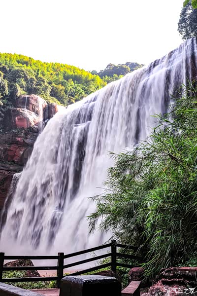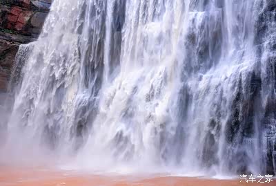 仰望天空,瀑布高高地悬在峡谷之上,山的两边是V形,树木茂盛,一堵白色的瀑布墙挂在天地之间。仔细看,后面的瀑布墙隐约地折叠着山峦,高76米,宽80米,高和宽近似,赤水瀑布在壮观的噪音中奔流直下,以展示其自然之美。瀑声太大了,不间断地轰骇着,跌落着,天籁之音恒定在一个震荡的节拍上,磅礴、澎湃、雄浑、没有休止符。