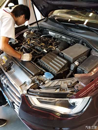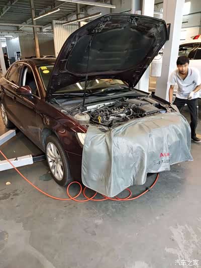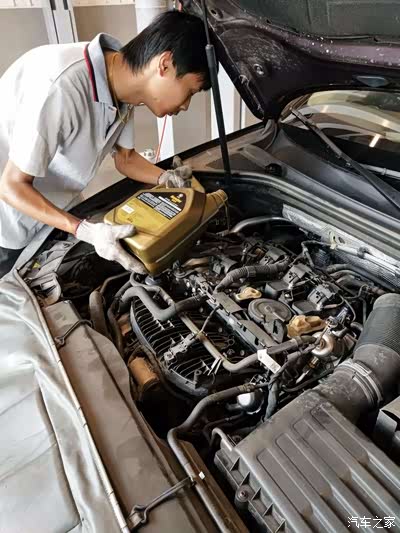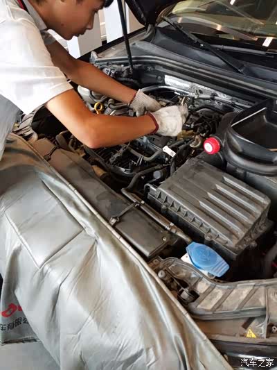 抽机油的同时,小师傅在换机滤,EA888的发动机机滤是在上面的,换机滤很方面的。