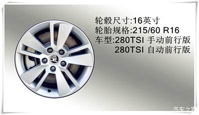 280TSI 手动前行版和280TSI 自动前行版两款车型配备的是这款16英寸轮毂,轮胎规格为215/60