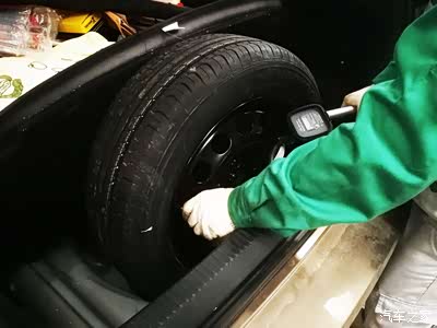 检查轮胎外观,挑出夹在轮胎花纹缝里的小石子。