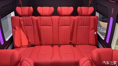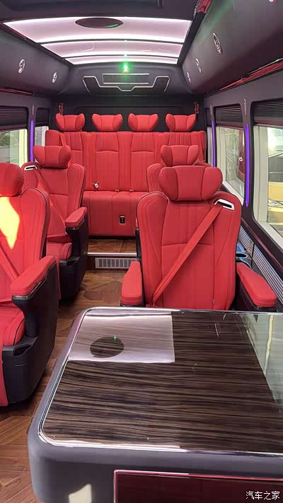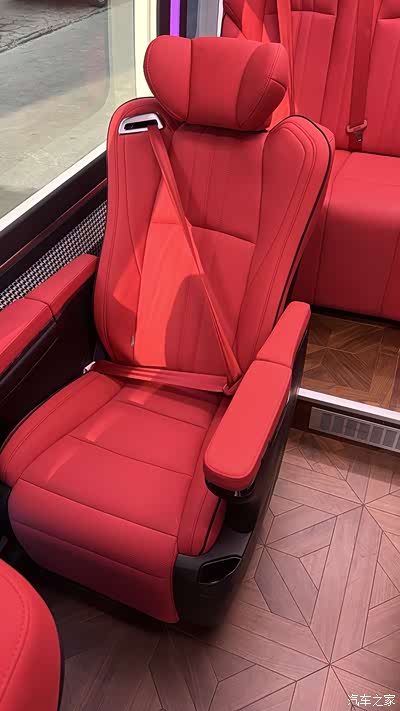 拉开车门,黑红交织的奢华美学扑面而来。车内采用双色拼接设计,黑色真皮座椅以红色缝线勾勒出精致轮廓,搭配座椅表面的菱形格纹绗缝工艺,触感细腻且视觉层次丰富。驾驶舱区域,黑色钢琴烤漆面板与红色启动按键形成强烈对比,科技感与仪式感并存;乘客舱的12座布局经过精心规划,第二排配备的行政级航空座椅堪称“移动头等舱”,支持180°电动旋转、多段式按摩与腿托调节功能,表面的红色皮质点缀与黑色主体相得益彰,配合车顶星空顶与红黑双色氛围灯带,营造出浪漫而私密的专属空间。