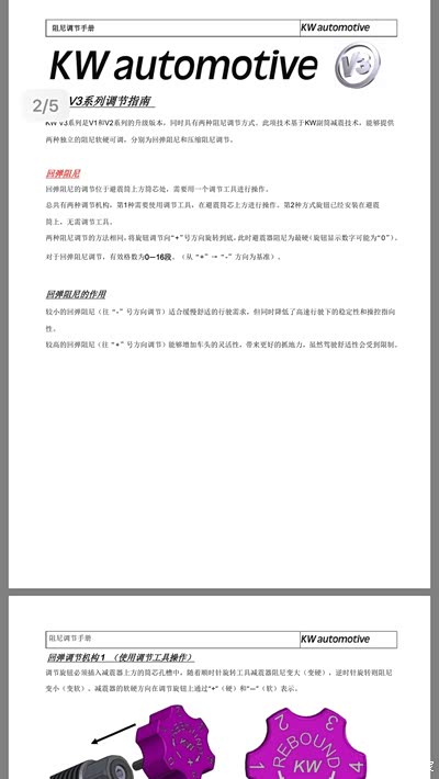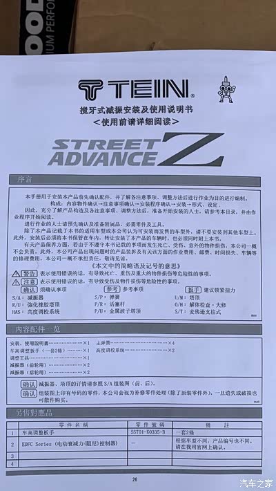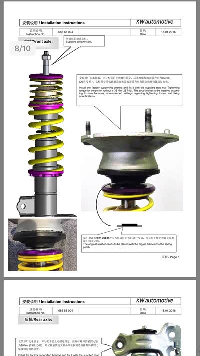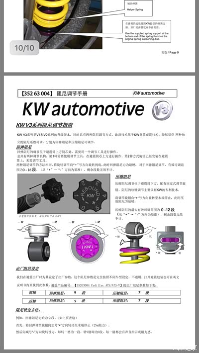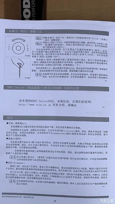 就放点图片吧……懒得码字了....前面是tein saz,后面kw v3 。各自附有安装和调整的说明书(kw v3是电子版的)