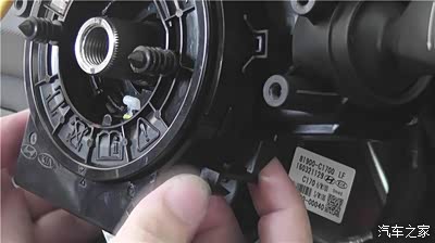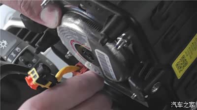 这样我们就可以把气囊拿掉,放一边,接着把白色线速插头拔掉,用21号套筒把中间大螺丝松掉,拿下,松这个螺丝的时候需要旁边一个人用手扶一下。