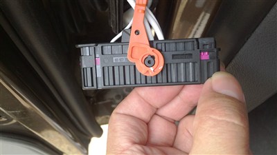 然后把线速连接车门的橡胶套基座拽出来,先按进去再拉出来会很容易。这样车门内和这一侧就通了,用跟铁丝带着喇叭线直接就可以穿过来,从车门橡胶基座后面插破橡胶套就可以把线伸进橡胶保护套里,跟其他线束一起出来,然后将插针要插入这个黑色的接头端子里,注意粉色的插针锁,要用一字螺丝刀从上图左侧顶粉色的插针锁的位置,插针锁会向右移动一小格,正好可以将插针插入。注意看好方向和正负极,插进去可就不好拔了。然后在右侧按插针锁就可以将插针锁归为,本人就是没好好研究这个插针锁,结果把这个插针锁弄得很可怜,还好不影响其功能,反正以后也不能总拆这个东西。