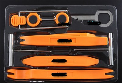 门卡子撬的方法很特殊,需要用叉头的撬版,伸进门板,找到卡子位置,向外拔,具体卡子图片很多,撬的方法要找准发力的位置就可以拔出来,撬坏也没事,网上卖的大把,虽然我一个没撬坏,不过后来还是买了10个,换了一些,为了让门板紧实一些。