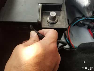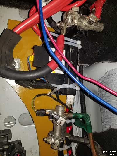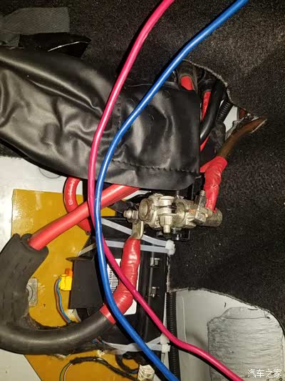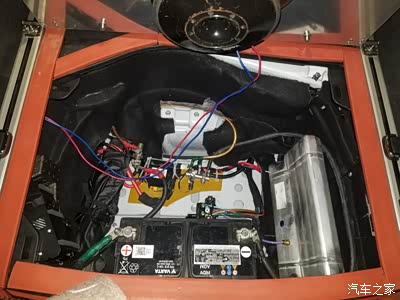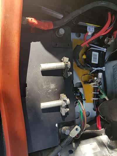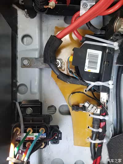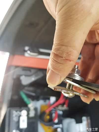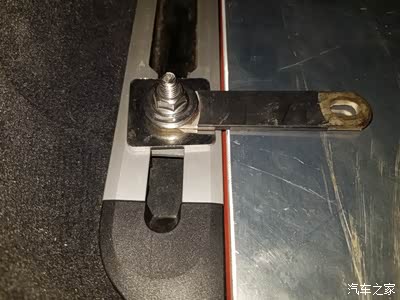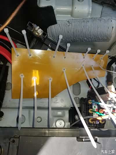电木板的下部用自制的固定片固定在原电池支架的螺丝孔位,这样正、负极之间以及与车身的绝缘问题解决了,也固定就位,方便电瓶延长线的接入。